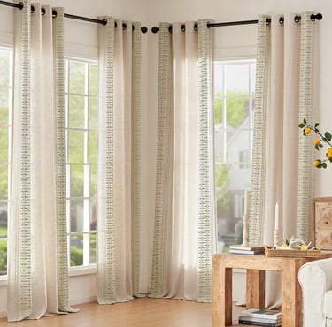 And last but certainly not least, the window treatments!! We have a lot of solids in our room today. Let's try a patterned light-filtering drapery panels for the utmost in elegance that ties the whole room together. Click here!